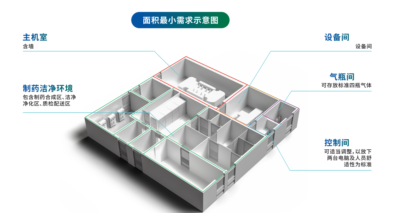 基本功能包含回旋加速器間、設備間、控制間、氣瓶間、制藥潔凈環(huán)境等。